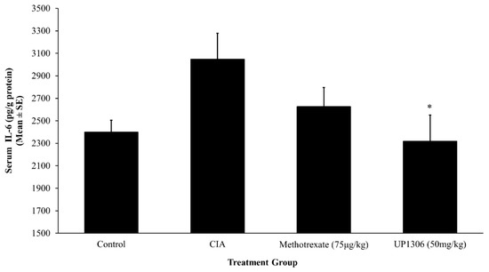 | Arthritis Index | 0 | 13.50 ± 0.80 | 5.55 ± 0.51 * | 6.60 ± 0.50 * |