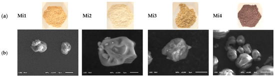 Morphology of microcapsules of iron encapsulated in thermo-resistant modified starch: (a) digital images; (b) scanning electron microscopic micrographs. FS—ferrous sulphate; FL—ferrous lactate; Mi1—FS; Mi2—FS and Vitamin C; Mi3—FL; Mi4—FL and Vitamin C.