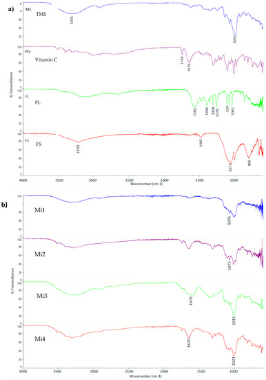 FTIR spectra for: (a) components used to build microcapsules (TMS—thermo-resistant modified starch; FS—ferrous sulphate; FL—ferrous lactate); and (b) preparations of iron encapsulated in thermo-resistant modified starch (Mi1—FS; Mi2—FS and Vitamin C; Mi3—FL; Mi4—FL and Vitamin C.