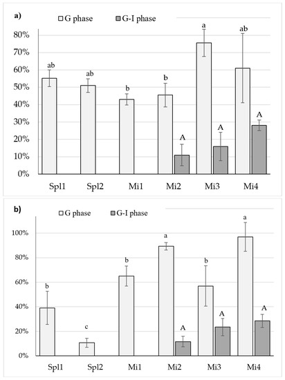 Percentage content of Fe2+ in the digests of: (a) bread; and (b) breakfast sandwich in the presence of preparations (Spl1 and Spl2—dietary supplements; Mi1—Mi4 fortifcants of encapsulated iron) after simulated gastric and gastrointestinal digestion. The content was expressed as the percentage of Fe2+ relative to total ionic iron content (Fe2+ + Fe3+). Results are presented as the means ± SD; n = 3. Values with the same letter are not significantly different p < 0.05. a, b, c—Letters represent differences between digestates; capital (A): G-I- phase, lowercase (a, b, c): GI- phase
