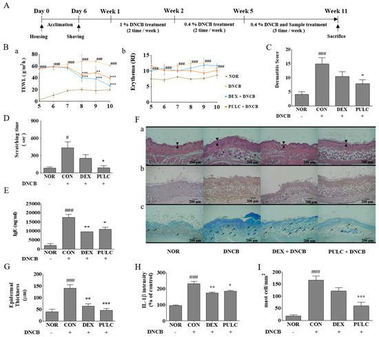 Experimental schedule and effects of PULC in DNCB-induced NC/Nga mice. (A) Experimental schedule for the induction of atopic dermatitis (AD) lesions; (B) Trans-epidermal water loss (TEWL) and erythema scores (a) TEWL (b) erythema scores; (C) Weekly clinical skin severity scores; (D) Scratching time on the last day of the experiment; (E) IgE levels evaluated on the last day of the experiment using enzyme-linked immunosorbent assay (ELISA); (F) Histological examination (a) H&E stain, arrows indicate thickness of the epidermis (b) IL-1β stain (c) toluidine blue stain, arrows indicate mast cells (scale bar = 200 μm); (G) Epidermal thickness; (H) IL-1β intensity; (I) Mast cell count. NOR, untreated group; CON, DNCB-treated groups; DEX, positive control (Dexamethasone 0.1%) treated group; PULC, PULC 0.5% treated group. Data represent the mean ± SEM. (N = 9) # p < 0.05, ### p < 0.001 vs. the NOR group; * p < 0.05, ** p < 0.01, and *** p < 0.001 vs. CON group.