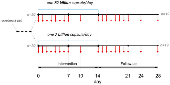 Eligible participants were invited to a detailed explanation of the study. Candidates willing to participate signed an informed consent document, were instructed on the procedures for the storage and transportation of the fecal samples and were provided with all material necessary for the study, including 14 + 2 extra capsules of the probiotic product; 19 plastic jars for the collection of all fecal samples (each one marked with the number of the respective collection day); disposable plastic bags for the transportation of the jars; a calendar with each day of fecal sample collection highlighted; a detailed protocol with all the information provided to properly follow the study time-line; and daily questionnaires to be filled out for all 28 days of the study. Volunteers had to report daily bowel habits according to the Bristol Stool Chart. In addition, volunteers were asked to report symptoms related to meteorism, flatulence, and nausea and any other anomalous adverse or positive symptoms weekly. Forty subjects were recruited (27 females and 13 males) and randomized into two arms with 20 subjects each: arm A (from Subject S01 to S20, mean age 29.2 ± 10.5; 15 females and 5 males) received the 7 billion dose, whereas arm B (from S21 to S40, mean age 29.1 ± 8.6; 12 females and 8 males) received the 70 billion dose. The study entailed 2 weeks of probiotic consumption and 2 weeks of follow-up (Figure 1). For the entire duration of the trial, volunteers were asked to follow their usual diet, with the only recommendation to avoid intake of other probiotic products, either as fermented dairy products or as food supplements. Consumption of traditional yogurt was allowed. Volunteers were instructed to consume the probiotic product in the morning, at least half an hour before breakfast, or in the evening, at least 2 h after the meal and to keep the probiotic capsules at room temperature. At the end of the study, volunteers returned the filled-in questionnaires and the two extra probiotic capsules to the laboratory.