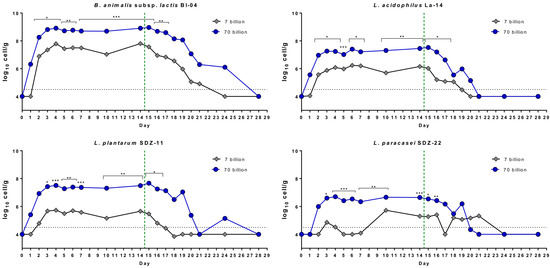 Mean recovery per day of the four probiotic strains simultaneously administered to volunteers during the ECoCePPI study with a multistrain formulation at two doses. Data come from qPCR experiments with strain-specific primers. Statistics according to two-tailed unpaired t-test; *, p < 0.05; **, p < 0.01; ***, p < 0.001.