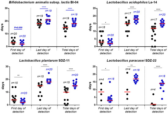 First, last, and total days of detection of probiotic strains in the fecal samples of volunteers receiving the 7 billion (black circles) and 70 billion (blue circles) formulations as demonstrated by qPCR analyses. Statistical analysis was performed according to a two-tailed unpaired t-test; *, p < 0.05; **, p < 0.01; ****, p < 0.0001.