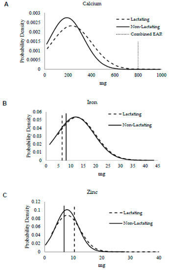 Overlaid mineral intake distributions from lactating (dashed curved line) and non-lactating (solid curved line) women assessed by 24-h dietary recall for minerals with estimated average requirements (EARs). Vertical lines represent EARs for minerals for lactating women (dashed line) and non-lactating women (solid line), the dotted vertical line represents EARs that do not differ with lactation in the case of calcium. Two-sample t-tests were used to compare mean intake differences for each mineral: (A) calcium (p = 0.004), (B) iron (p = 0.54), and (C) zinc (p = 0.89).