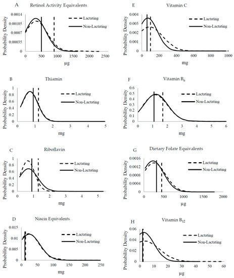 Overlaid vitamin intake distributions from lactating (n = 180, dashed curved line) and non-lactating (n = 342; solid curved line) women assessed by 24-h dietary recall for vitamins of interest in comparison with the estimated average requirements (EARs). Two-sample t-tests were used to compare mean intake differences for each vitamin: (A) vitamin A (p = 0.62), (B) thiamin (p = 0.69), (C) riboflavin (p = 0.42), (D) niacin (p = 0.65), (E) vitamin C (p = 0.06), (F) vitamin B6 (p = 0.65), (G) folate (p = 0.29), and (H) vitamin B12 (p = 0.38). Vertical lines represent EARs for vitamins for lactating women (dashed line) and non-lactating women (solid line).