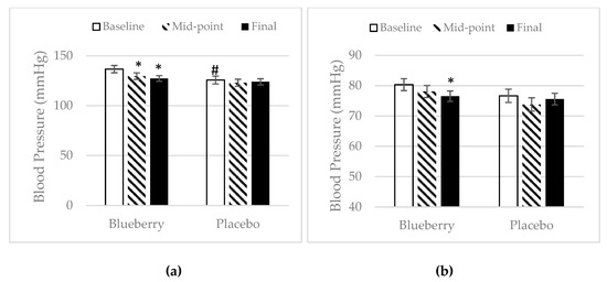 For body weight, height, and BMI, there was no significant difference between treatment groups at baseline. The body weight increased significantly at final point over baseline and midpoint in the placebo group, whereas the blueberry group maintained their body weight throughout the study, as shown in (Figure 1a). In the blueberry group, participants maintained their BMI throughout the study period, while participants in the placebo group had a significant increase in BMI at final point over baseline and midpoint (Figure 1b). A significant difference in systolic blood pressure between the two treatment groups was noted at baseline, but not of diastolic blood pressure. In the blueberry group, participants’ systolic blood pressure decreased significantly at midpoint over baseline and remained at the reduced level at final point (Figure 2a). Also, participants’ diastolic blood pressure dropped significantly at final point over baseline in the blueberry group (Figure 2b). There were no significant changes of systolic and diastolic blood pressure in the placebo group throughout the study. Besides the baseline differences in systolic blood pressure, there was no significant difference between the blueberry and the placebo group in regard to weight, height, BMI, or systolic and diastolic blood pressure, at any time point.
