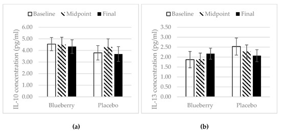 IL-10 (a) and IL-13 (b). Mean ± SEM. N = 26 for the blueberry group, N = 22 for the placebo group. No significant changes over time and between groups at any time point. However, an increase of 0.30 pg/mL in plasma concentration of IL-13 was noted at final point as compared to baseline in the blueberry group, while a decrease of 0.46 pg/mL in concentration was noted at final point as compared to baseline in the placebo group.