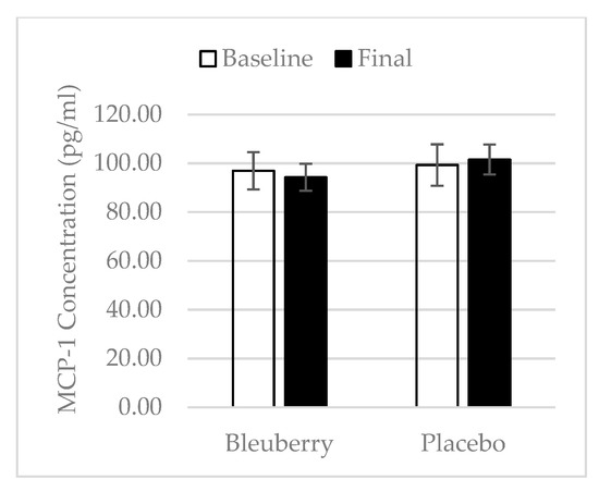 There were no changes in plasma concentration of inflammatory biomarkers in the blueberry group over the study period. In the placebo group, there was a significant increase in the plasma concentration of TNF-α at midpoint over baseline, but there was a decrease at the final point over midpoint (Figure 5a). There was also an increase in IL-1β at midpoint over baseline with a decrease at final point over midpoint, and no change overall for final point over baseline (Figure 5b). IL-6 concentration remained consistent over the study periods in the placebo group (Figure 5c). For the anti-inflammatory biomarkers, the plasma concentration of IL-10 and IL-13 stayed the same over the study period for both treatment groups. However, there was an overall increase in concentration of IL-13 at final point over baseline (+0.30 pg/mL) in the blueberry group, while there was an overall decrease in the placebo group at final point over baseline (−0.46 pg/mL) (Figure 6b). The concentration of MMP-3 and MMP-13 in the blueberry group showed a decrease at midpoint over baseline and continued to decrease at final point, but the decreases at both midpoint and final point over baseline did not reach statistical significance. The plasma concentration of MMP-13 stayed the same over the study period in the placebo group (Figure 7b). The MMP-3 concentration decreased at midpoint over baseline but rebounded at the final point (Figure 7a). A decrease in concentration of MCP-1 was observed in the blueberry group, while an increase in MCP-1 was observed in the placebo group (Figure 8). However, the changes did not reach significance. No significant changes of the inflammatory biomarkers, anti-inflammatory biomarkers, and MMPs were observed in the female only population.
