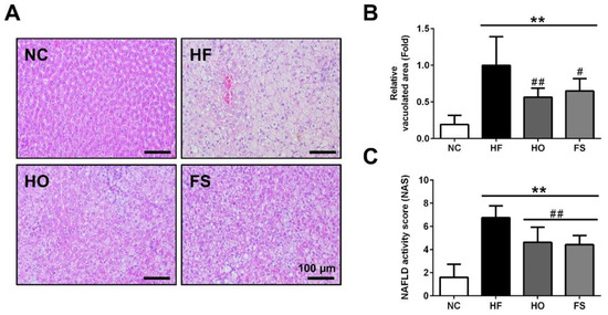 Hepatic paraffin sections (5 μm) were performed for histological examination. The tissue sections were stained with hematoxylin and eosin (H&E). The images were observed by a microscope equipped with a digital camera. The histopathological scoring was according to “NAFLD activity score” as previously described by Dyson et al. (2014) [15]. Relative vacuolated areas in liver tissues were calculated with the ImageJ 1.48 software (National Institutes of Health, Bethesda, MD, USA).