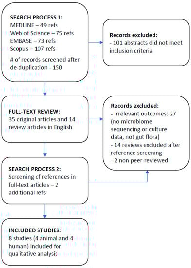 Search strategy: This review followed the Preferred Reporting Items for Systematic Reviews and Meta-Analyses (PRISMA) guidelines. We searched Web of Science, MEDLINE, EMBASE, and Scopus databases for articles in English published in peer-reviewed journals and indexed up until July 2018. We used multiple search terms capturing microbiome, microflora, intestinal microbiota/flora, gut microbiota/flora and glucosamine or chondroitin concepts (Appendix A). Search terms were reviewed with an experienced librarian.