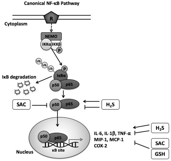 Moreover, AGE, GSH, and H2S are known to affect NF-κB activation, the major pathway involved in inflammation. In fact, it has been suggested that both AGE and GSH act as anti-inflammatory mediators by attenuating NF-kB activation, however, H2S has been shown to work in both ways depending on the study model conditions and the concentration of the endogenous source. Figure 1 illustrates the mechanistic effect of GSH, SAC and H2S in the canonical NF-κB pathway.