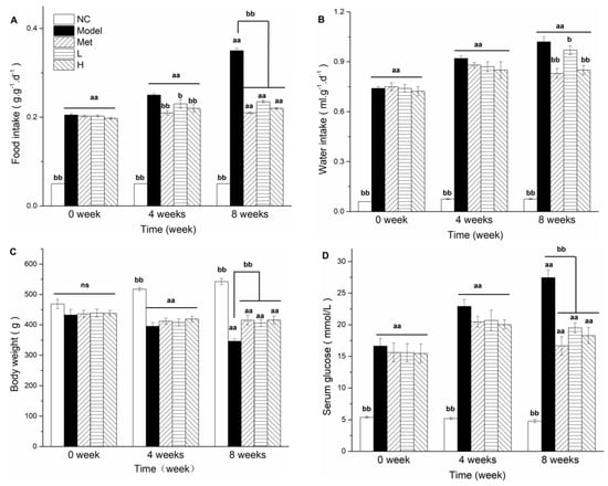PLE and Metformin treatments inhibited overeating, body weight loss, and FBG level in diabetic rat model. Food intake (A), water intake (B), body weight (C), and FBG level (D) were measured at 0, 4, and 8 weeks. Data are expressed as mean ± SEM (n = 7 for each group). aa p < 0.01, a p < 0.05 for Model, Met, L, and H vs. NC. bb p < 0.01, b p < 0.05 for NC, Met, L, and H vs. Model. ns: no significance.