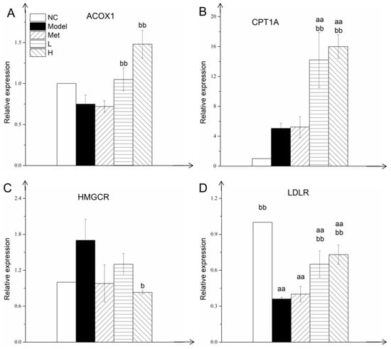 Total RNA was extracted from liver using TRNzol Universal Reagent (cat # DP424, Tiangen Biotech (Beijing) Co., Beijing, China), and RNA quality was evaluated using Ultra-Micro UV spectrophotometer. mRNA was reverse-transcribed into cDNA using HiScript II Q RT SuperMix for qPCR kit (Vazyme Biotech Co., Nanjing, China). qRT-PCR amplification was performed using AceQ SYBR Green Master Mix kit (Vazyme) with three repeats for each reaction, as follows: 95 °C for 1 min, followed by 40 cycles of 95 °C for 10 s and 60 °C for 30 s. Detailed information is given in Supplementary Table S3 for qRT-PCR primers of fructose-1,6-bisphosphatase (FBPase), glucose-6-phosphatase (G6Pase), solute carrier family 2 member 2 (GLUT2), glucokinase (GCK), acyl-CoA oxidase 1 (ACOX1), carnitine palmitoyltransferase 1A (CPT1A), 3-hydroxy-3-methylglutaryl-CoA reductase (HMGCR), low-density lipoprotein receptor (LDLR), and β-actin. Relative gene expression was assessed by 2−ΔΔCt method using β-actin as reference.