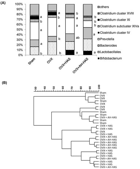 The faecal microbiota of mice was influenced by intake of HAS or AH-HAS (Figure 1A,B). The abundance of Bifidobacterium spp. in the OVX + HAS and OVX + AH-HAS groups (9.75 ± 2.57% and 8.08 ± 2.07%, respectively) was significantly higher than that in the sham or OVX groups (0.22 ± 0.22% or 0.00 ± 0.00%, respectively) (Figure 1A). The abundance of Bacteroides spp. in the OVX + AH-HAS group (22.41 ± 2.01%) was significantly higher than that in the OVX group (10.54 ± 1.90%). The abundance of Prevotella spp. in the OVX + AH-HAS group (13.32 ± 3.77%) was significantly lower than those in the sham, OVX, or OVX + HAS groups (35.17 ± 4.97%, 36.96 ± 4.78% and 30.98 ± 1.94%, respectively). The abundance of Clostridium cluster IV spp. in the OVX + HAS and OVX + AH-HAS groups was 0.25 ± 0.04% and 0.04 ± 0.04%, respectively, but those species were not detected in the sham or OVX groups (Figure 1A). The abundance of Clostridium cluster XI in the OVX + HAS and OVX + AH-HAS groups (0.64 ± 0.41% and 0.35 ± 0.10%, respectively) was significantly lower than those in the sham and OVX groups (5.91 ± 1.04% and 5.61 ± 1.43%, respectively) (Figure 1A).