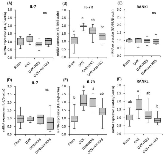 RANKL is an important osteoclast-specific gene and a critical regulator of osteoclast development and bone metabolism []. RANKL expression is upregulated by inflammation related-cytokines and hormones. On day-14, we did not observe any significant effects of AH-HAS on expression of RANKL mRNA, although we did observe some effects on IL-7R expression in the bone marrow, as well as significant AH-HAS effects on RANKL expression on day-42. Therefore, these results suggest: (i) ovariectomy-induced expression of pro-inflammatory in bone-marrow cells; (ii) ovariectomy-induced osteoclastic RANKL expression might be downregulated by a diet supplemented with AH-HAS.
