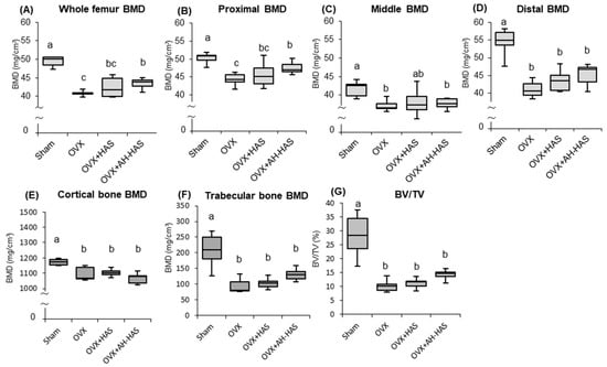 BMDs of the whole as well as the proximal, middle, and distal regions of the femurs of OVX mice were significantly lower than those of the sham group (Figure 4A–D). AH-HAS treatment attenuated bone loss in the whole and proximal region of the femur significantly (Figure 4A,B). There were no significant differences among the OVX groups with regard to the BMD of the middle and distal region of the femur (Figure 4C,D).
