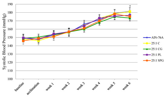 Beginning at week 3, average systolic blood pressure decreased in SHRs consuming diets containing CG, PL and SPG in comparison to those consuming the AIN-76A and control diets (Figure 1). At week 6, consumption of the CG (173.4 mmHg) diet resulted in a decrease (p < 0.05) in systolic blood pressure compared to the AIN-76A (181.4 mmHg) and control (181.1 mmHg) diets. Among SHRs consuming diets containing GLVs, CG were able to modulate slightly greater non-significant decreases in systolic blood pressure in comparison to PL and SPG.