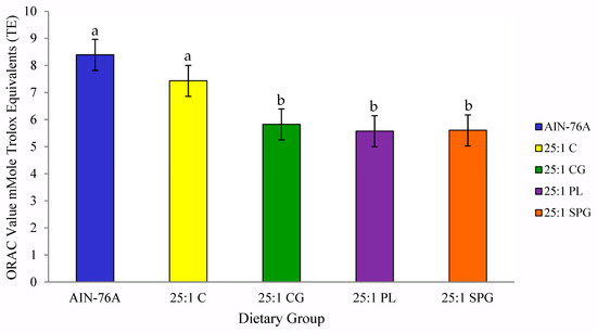Mean plasma ORAC concentration of SHRs consuming the AIN-76A diet and diets with a 25:1 ω-6/ω-3 FAR for 6 weeks. Results are presented as mean ± SEM mMole TE/L of 10 SHRs per dietary group; bars with different alphabetical superscripts indicate statistical significance at p < 0.05 according to Duncan’s post hoc test values.