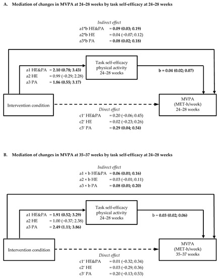 | Task self-efficacy for physical activity (range 3–30) | 2.11 (0.81; 3.42) | 0.002 | 1.09 (−0.18; 2.37) | 0.09 | 1.89 (0.59; 3.18) | 0.004 |