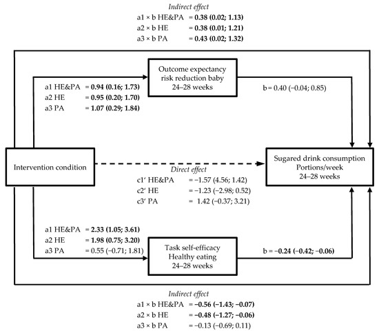 | Outcome expectancy risk reduction baby with healthy eating (range 2–20) | 0.89 (0.13; 1.66) | 0.02 | 0.91 (0.16; 1.66) | 0.02 | 0.95 (0.19; 1.72) | 0.01 |