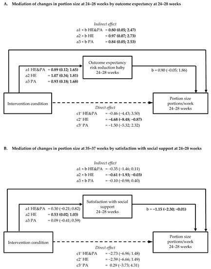 | Outcome expectancy risk reduction baby with physical activity (range 2–20) | 1.29 (0.39; 2.18) | 0.04 | 0.85 (−0.03; 1.74) | 0.06 | 1.25 (0.36; 2.13) | 0.01 |