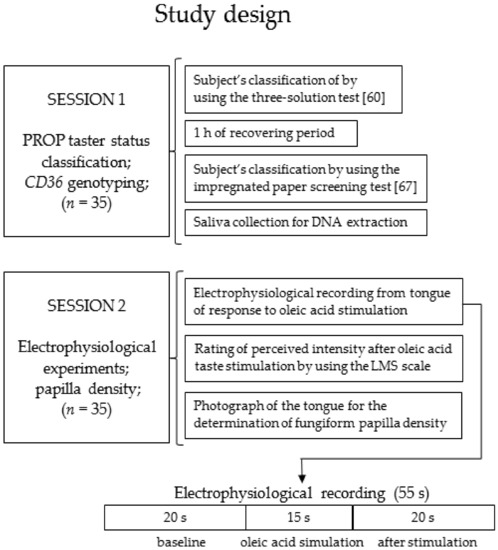 Volunteers were tested in two sessions on two successive days. On the first day, each subject was classified for his/her PROP taster status, while on the second day he/she was tested for the electrophysiological response to oleic acid taste stimulation on a small area of the tongue tip and for the fungiform papillae density on the same area of the tongue surface. Volunteers were always requested to abstain from drinking (except water), eating, using chewing gum or oral care products for at least 2 h prior to testing. All had to be in the test room 15 min before the beginning of the session (9:00 AM) in order to acclimate to the constant environmental conditions (23–24 °C; 40–50% relative humidity). Women were always tested around the sixth day of the menstrual cycle to avoid taste sensitivity changes due to the estrogen phase [59]. All solutions (in spring water), which were used for the measures at room temperature, were prepared and stored in a refrigerator until 1 h before testing. Stimuli were presented.