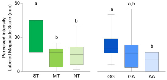 Box-and-whisker plots showing the minimum, first quartile, median, third quartile, and maximum of each set of perceived intensity data evoked by taste stimulation with oleic acid (30 µL) in super-tasters (ST; n = 10), medium-tasters (MT; n=13) and non-tasters (NT; n = 12) and in volunteers with genotypes GG (n = 9), GA (n = 20) and AA (n = 6) of CD36. Different letters indicate a significant difference (p ≤ 0.046; Duncan’s test and p = 0.047 Fisher LDS test, subsequent one-way ANOVA).