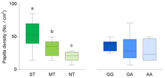 Box-and-whisker plots showing the minimum, first quartile, median, third quartile, and maximum of each set of density of fungiform papillae data in super-tasters (ST; n = 10), medium-tasters (MT; n = 13) and non-tasters (NT; n=12) and in volunteers with genotypes GG (n = 9), GA (n = 20) and AA (n = 6) of CD36. Different letters indicate a significant difference (p ≤ 0.032; Duncan’s test subsequent one-way ANOVA).