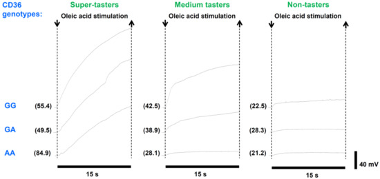 Another important physiological feature we observed was a relationship between the values of the hyperpolarization amplitude and rate, and the rs1761667 polymorphism of the CD36 gene. In agreement with evidence showing that the presence of the homozygous AA genotype at this location of the CD36 gene is characterized by reduced protein expression [19] and low taste sensitivity to fats [5,20,21,22], we measured the lowest amplitude values and biopotential variation rates in volunteers carrying two A alleles who verbally reported the lowest values of perceived intensity. Likewise, we measured the highest bioelectrical values in volunteers with the GG genotype who perceived the highest intensity of oleic acid and intermediate values in heterozygous volunteers who reported intermediate values of perceived intensity. As expected, no variations in the density of papillae related to CD36 genotypes were found.