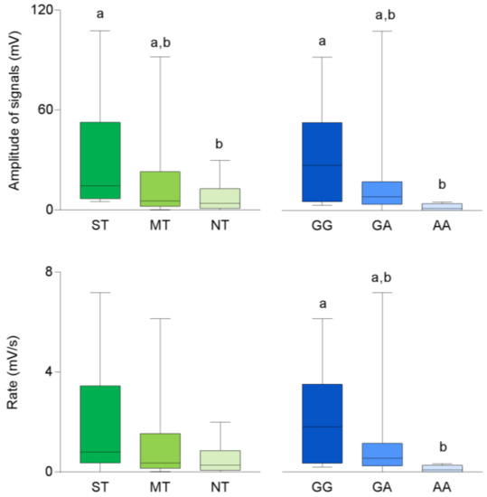 Box-and-whisker plots showing the minimum, first quartile, median, third quartile, and maximum of each data set of amplitude and rate of signals evoked in super-tasters (ST; n = 10), medium tasters (MT; n = 13) and non-tasters (NT; n = 12); and in volunteers with genotypes GG (n = 9), GA (n = 20) and AA (n = 6) of CD36 by oleic acid (30 µL) taste stimulation. Different letters indicate a significant difference (p ≤ 0.05; Fisher LDS or Duncan’s test subsequent one-way ANOVA).