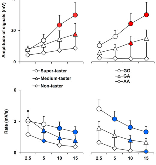 Mean values ± SEM of the amplitude and hyperpolarization rate of signals recorded in response to oleic acid taste stimulation in volunteers categorized for their PROP taster status and genotyped for the rs1761667 SNP of the CD36 gene are shown in Figure 5. Values determined in super-taster volunteers were significantly higher than those measured in non-tasters, although they are at the limits of statistical significance (p = 0.052; Duncan’s test subsequent one-way ANOVA), while medium-tasters showed biopotential changes which were not different from those of the other two taster groups (p > 0.05). In addition, the values determined in homozygous GG volunteers were higher than those of volunteers with the AA genotype (p = 0.043; Fisher LDS test subsequent one-way ANOVA). No differences between heterozygous and homozygous volunteers were found (p > 0.05). Volunteers with the GG genotype also showed higher values of hyperpolarization rate than volunteers with the AA genotype (p = 0.028; Fisher LDS test subsequent one-way ANOVA), while heterozygous volunteers did not show different hyperpolarization rate values from the other groups (p > 0.05). No differences in the rate values related to PROP taster status were found (p > 0.05). One-way ANOVA also showed that no differences in the amplitude and hyperpolarization rate of signals were found in relation to the TAS2R38 genotype (Figure S1) or gender (p > 0.05).