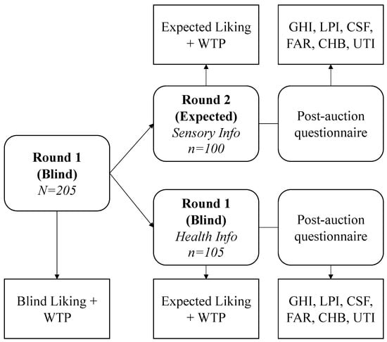 Experimental design. WTP (willingness-to-pay), GHI (General Health Interest), LPI (Light Product Interest), CSF (Craving for Sweet Foods), FAR (Food as A Reward), CHB (Compensatory Health Beliefs), UTI (Unhealthy=Tasty Intuition).