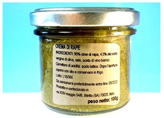 In the blind tasting round (Round 1), the products were offered to individuals one at a time on a white plastic spoon containing 4 grams of product and, for each participant, a package of unsalted crackers was placed on a small paper plate together with a bottle of still spring water. The order of samples was randomized across sessions according to a Latin square that was balanced for order and first-order carry-over effects [53]. Participants were also asked to rinse their palate with still water and eat a cracker for neutralization between tasting different samples. To increase realism, pesto jars were handed out to participants before collecting the bids. To prevent the influence of brand, such as packaging and other external cues, the three jars were provided with a label containing only the legally required information (Figure 2).