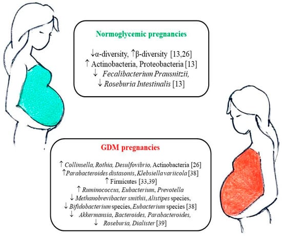 - Ferrocino, I.; Ponzo, V.; Gambino, R.; Zarovska, A.; Leone, F.; Monzeglio, C.; Goitre, I.; Romano, A.; Grassi, G.; Broglio, F.; et al. Changes in the gut microbiota composition during pregnancy in patients with gestational diabetes mellitus (GDM). Sci. Rep. 2018, 8, 122216. [Google Scholar] [CrossRef] [PubMed]