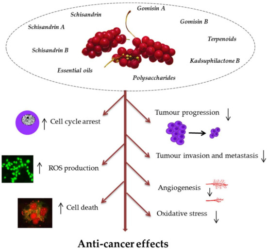 Mechanisms of anti-cancer activity of bioactive phytochemicals in Schisandra chinensis (SCE). They may inhibit tumour progression through cell cycle arrest at G0/G1 and G2/M, suppression of proliferation, invasion, metastasis, and angiogenesis. SCE antioxidative action includes induction of the antioxidant enzymes and direct scavenging of reactive oxygen species (ROS) to prevent cancer induction and progression. Their pro-oxidant effects lead to increased ROS production in cancer cells and cell death (apoptotic and autophagic).