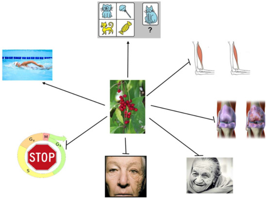 Schisandra chinensis and its derivatives can modulate aging-related phenomena in humans, experimental animals and cell cultures. They can suppress skin photoaging, ameliorate sarcopenia and osteoarthritis, increase physical endurance, inhibit stress-induced premature senescence, improve cognitive and behavioural functions, and modulate other effects that can also be associated with a delay of normal aging.