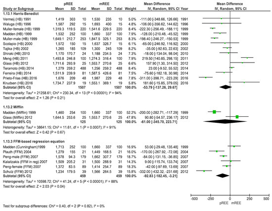 When grouping data across the studies using the same predictive equation, the magnitude of the discrepancy between mREE and pREE ranged from an underestimate of 54 to 93 kcal/d across equations. Although this appears to be quite modest when considered in the context of an entire day’s energy requirements, this result must be interpreted with caution. Notably, as demonstrated in Figure 2, using the HB equation, there was significant heterogeneity (I2 = 94%) with wide variations in individual comparative data, with several studies demonstrating large discrepancies between the mREE and pREE [28,30,42]. For example, the 95% limits of agreement for predictive values ranged from an underestimate of 399 kcal/day in the work of Prieto-Frias et al. [30] to an overestimate of 379 kcal/day in the work by Knusden et al. [28]. This difference is substantial.