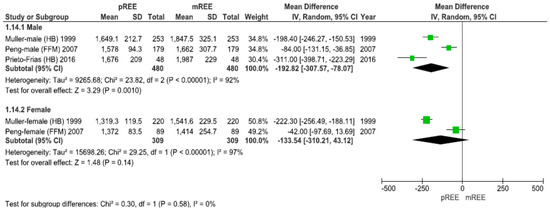 Forest plot of comparison: Measured Resting Energy Expenditure (mREE) vs. predicted REE (pREE)—subgroup: Sex. The aggregated data supports a greater underestimation of energy requirements in male patients versus female patients (p = 0.001). Abbreviations in parenthesis show the predictive equations employed by each study (i.e., FFM using the individual fat-free mass; HB Harris–Benedict).