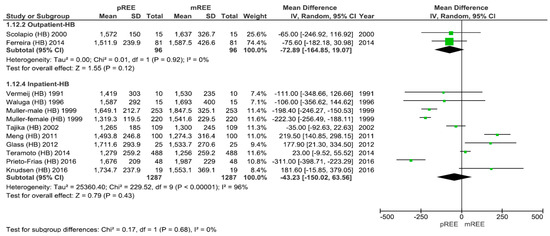 Data subdivided by hospitalization status (for the studies utilizing the HB equation) are presented in Figure 4, supporting no statistically significant difference between the value of pREE and mREE in outpatients (mean difference of −72.9; 95% CI: −164.8, 19.1) kcal/d, p = 0.12 versus inpatients (mean difference of −43.2; 95% CI: −150, 63.5) kcal/d, p = 0.43.