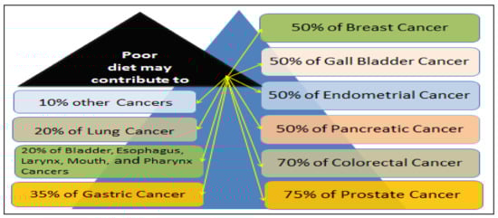 Estimation of cancer-related deaths associated with a poor diet. Eating a plant-based diet rich in vegetables and fruits has proven to significantly reduce cancer risk.