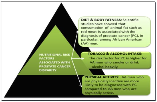 Prostate cancer (PC) is the second leading cause of non-cutaneous cancer-related deaths among males living in the United States [30]. Despite an increased emphasis on early detection through prostate specific antigen (PSA) screening, advanced early treatment, and improved understanding of the prostate cancer risk factors, the disparity remains. AA men have continued to have the highest mortality and lowest survival of prostate cancer, and all cancers combined [31,32,33]. On the contrary, the mortality rate of PC has consistently declined among white men and other ethnic groups in the United States [34]. The overall disparity in cancer between AA and Caucasian men accounts to about 40% of PC [35]. The possible reasons for this racial/ethnic disparity are not completely understood. However, factors such as race, genetics, age, poor diet, and physical inactivity may contribute to the occurrence of PC. In the following sessions, we discuss nutritional factors (diet, obesity, tobacco, alcohol, and physical exercise) that are associated with a socioeconomic status for PC, which are more likely to affect AA men when compared to any other ethnic groups. Figure 2 shows nutritional risk factors that are more likely to contribute to PC disparity.