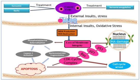 Figure 3 shows the common molecular mechanisms by which curcumin, garlic, and Vernonia amygdalina exert their anti-cancer activity in cancer cells. As shown in Figure 3, curcumin, garlic, and Vernonia amygdalina inhibited cell growth or caused cell growth arrest through the induction of DNA damage, expression of stress genes (p53, p21, Bax, and CDK cyclin complex), impact of cell cycle arrest, and triggered apoptosis by modulating phosphatidylserine externalization, activation of caspase-3, and nucleosomal DNA fragmentation.