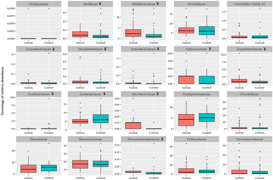 Relative abundance of family bacterial taxon in feces of children with ASD and healthy children. Boxplots were generated using the R software utilizing the ggplot2 package, and represent the most important bacterial families ¥ P < 0.05 vs. control group.