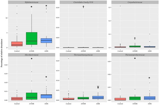 Relative abundances of selected bacteria according to family taxon in feces of children with ASD classified by mental regression and healthy children. Boxplots were generated using the R software utilizing the ggplot2 package and represent bacterial families * P < 0.05 vs. control group, † P < 0.05 vs. control and AMR groups, and ¥ P < 0.05 vs. control and ANMR groups using H Kruskal-Wallis test corrected by Bonferroni post-hoc test.