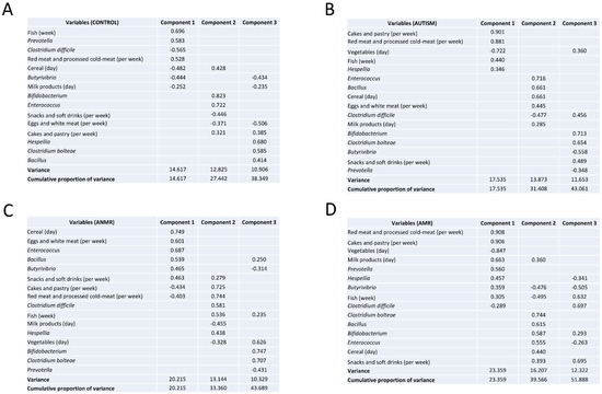 Principal component analysis between intestinal microbiota and food consumption in children with ASD and healthy children. Extraction of the initial set of uncorrelated components was accomplished with the principal factor method and then the orthogonal rotation of components was used to facilitate interpretation. Factor loading was used to interpret the factor structure. Loadings are equivalent to Pearson correlation coefficients, and a higher loading indicates a stronger relation between a factor and an observed variable. Strong loading was defined as a value ≥ 0.6; moderate as 0.4–0.59 and low as <0.4. (A) Control group, (B) Children with ASD, (C) Children with ANMR, (D) Children with AMR. ASD, children with autism spectrum disorders; AMR, children with autism mental regression; ANMR, children with autism non-mental regression.