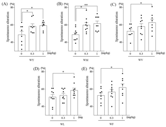 The effects of dipeptides (A) WY, (B) WM, (C) WV, (D) WL, and (E) WF on spatial memory in amnesic mice. Six-week-old Crl:CD1 male mice were orally administered 0, 0.3, or 1 mg/kg of dipeptide (WV, WM, WV, WL, and WF) and, 40 min later, injected intraperitoneally with 0.85 mg/kg of scopolamine. At 1 h after oral administration, each mouse was allowed to explore the Y-maze for 8 min. Spontaneous alternations were also measured. Data represent the mean ± SEM of 10 mice per group. The p values shown were calculated using the Dunnett’s test. *p < 0.05 and **p < 0.01.