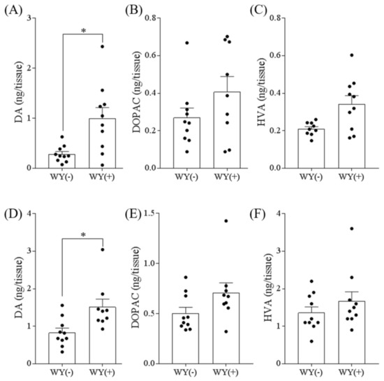 The levels of dopamine and its metabolites in the hippocampus and frontal cortex. Six-week-old Crl:CD1 male mice were orally administered 0 or 1 mg/kg of WY dipeptide. At 1 h after oral administration, the following monoamine levels were measured in the hippocampus (A–C) and frontal cortex (D–F) by HPLC: dopamine (DA) (A, D), 3,4-dihydroxyphenylacetic acid (DOPAC) (B, E), and homovanillic acid (HVA) (C, F). Data represent the mean ± SEM of 10 mice per group. The p values shown were calculated using the Student’s t-test. * p < 0.05.