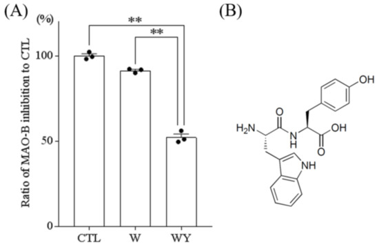 The inhibition of monoamine oxidase by the WY dipeptide and tryptophan and the chemical structure of the WY dipeptide. (A) The activity of monoamine oxidase B (MAO-B) was tested in the presence of 1 mM WY dipeptide or tryptophan (W). Data represent the mean ± SEM of triplicate per sample. The p values shown were calculated using the Dunnett’s test. ** p < 0.01. (B) The chemical structure of the WY dipeptide.