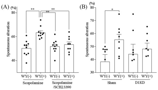 3.5. Inhibition of the Dopamine D1 Receptor Attenuated the WY-Induced Memory Improvement
